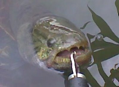 9 – Quando o anzol ficar bem preso na boca do peixe use o alicate de contenção e outro de bico para extraí-lo. No momento da retirada do anzol jamais tire a atenção dos dentes, ficando atento com as reações deste peixe. Por incrível que pareça um pequeno desvio de olhar ou um pequeno aliviar de pressão nos dedos quando estiver segurando-o é o bastante para que este peixe se contorça, podendo causar sérios acidentes com os anzóis ou as garatéias.
